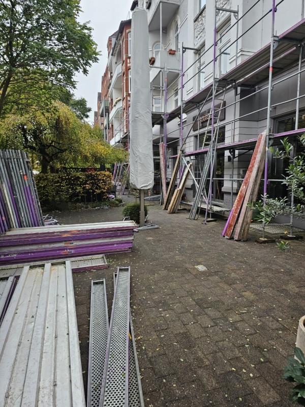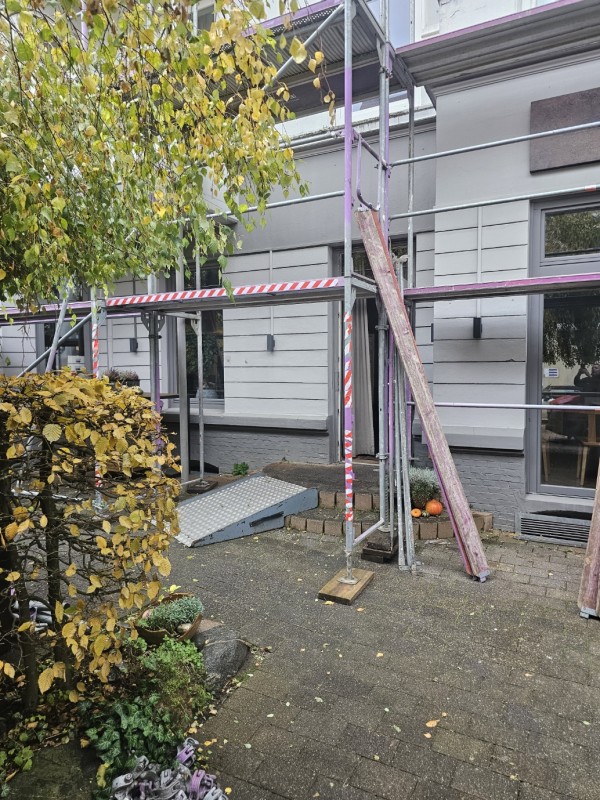 das Gerüst ist nun auch auf der Seite des Eingangs aufgebaut –