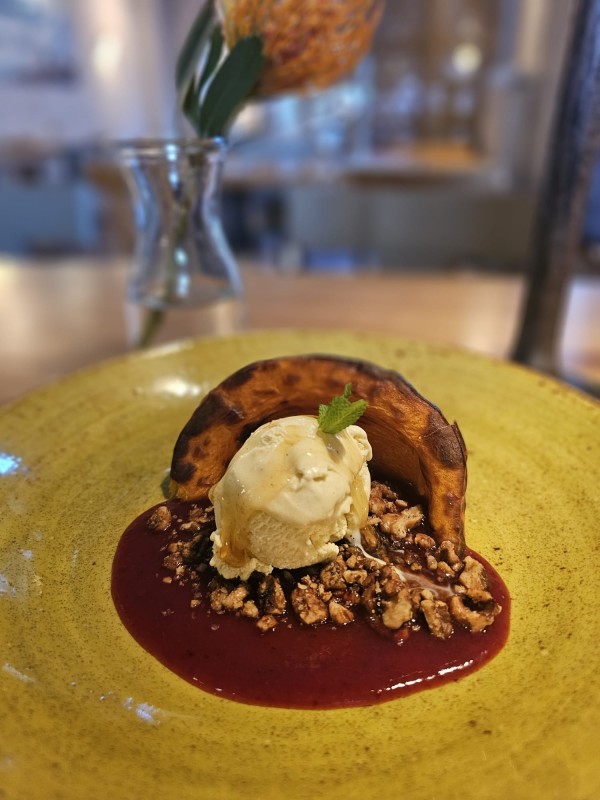 Ofengebackener Kürbis mit Vanilleeis, Walnusscrunch und fruchtiger Beerensoße –